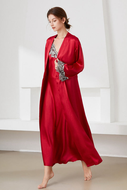Contrast Lace Trim Satin Night Dress and Robe Set